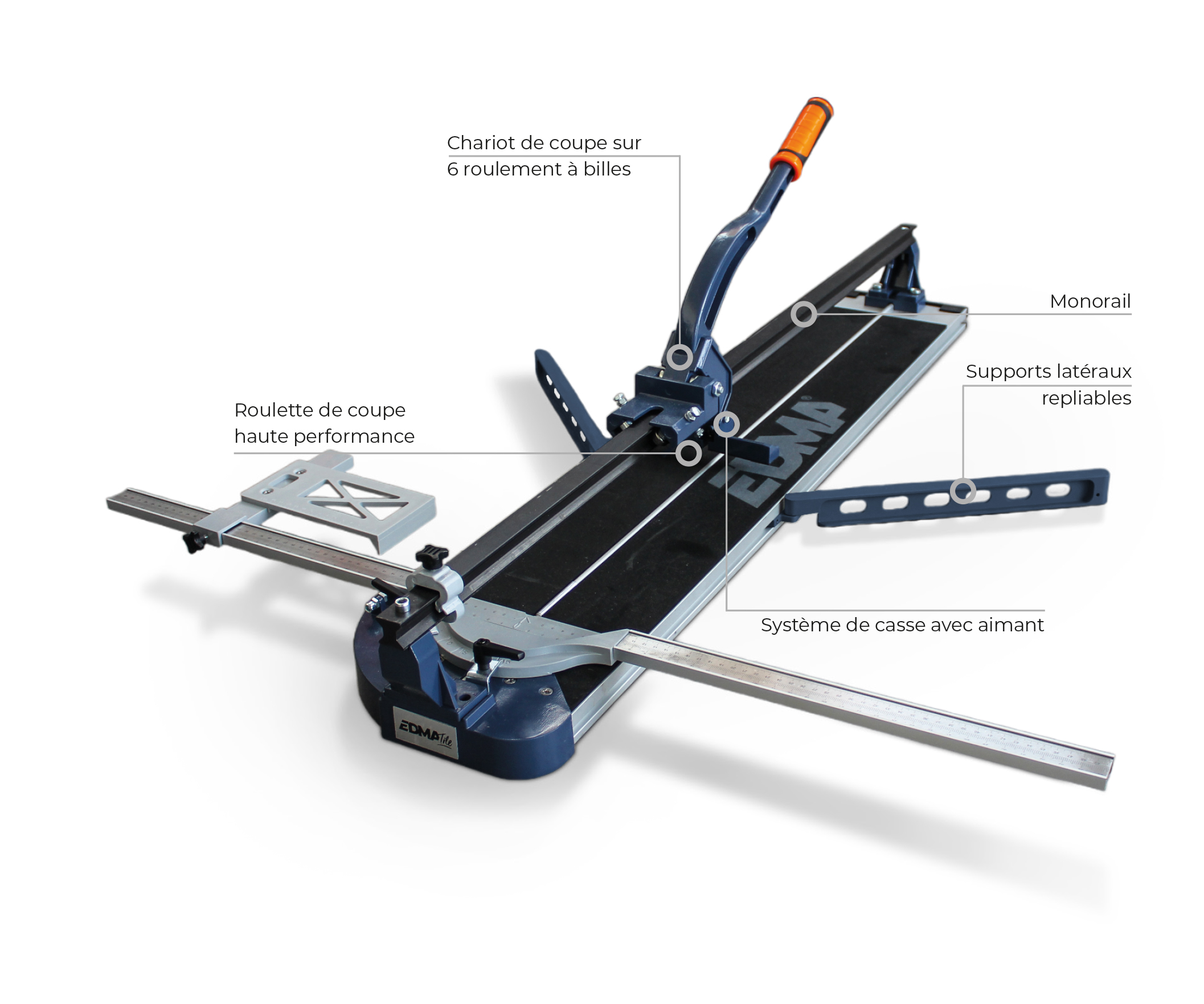 Lire le communiqué de presse EDMATILE 950 est un coupe-carreaux monorail, pour des coupes rapides et précises. Il permet des